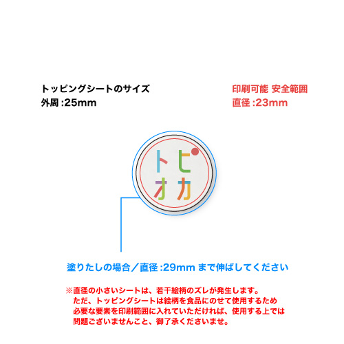 ゼラチンで出来た極薄のシートです。ラテの泡立てたミルクの上や、ホイップした生クリーム、プリン、パンケーキ、チーズ等,様々な食品にお使いいただけます。耐久性はありませんので、サーブする直前にご使用ください。 直径25mmの丸いシートが、A4サイズの台紙に70枚面付けされています。ご注文は直径25mmシートの枚数となります。 絵柄は1つの絵柄をプリントいたします。2つ以上の絵柄をご希望の場合は、絵柄ごとのご注文となります。 トッピングシートは乾燥や湿度にとても弱いため、バリア性の高いチャック付きのアルミ袋にいれてお届けいたします。